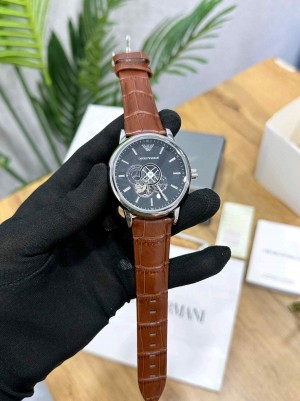 EMPORIO ARMANI_ AUTOMATIC SKELETON SILVER BROWN LEATHER BELT